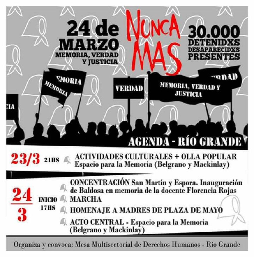 Con una olla popular y un festival musical, dieron inicio en la noche del viernes 23 en Río Grande, las actividades en conmemoración del Día Nacional de la Memoria por la Verdad y la Justicia. Este sábado 24 habrá una concentración en la esquina de San Martin y Espora, y un acto en el “Espacio para la Memoria”.