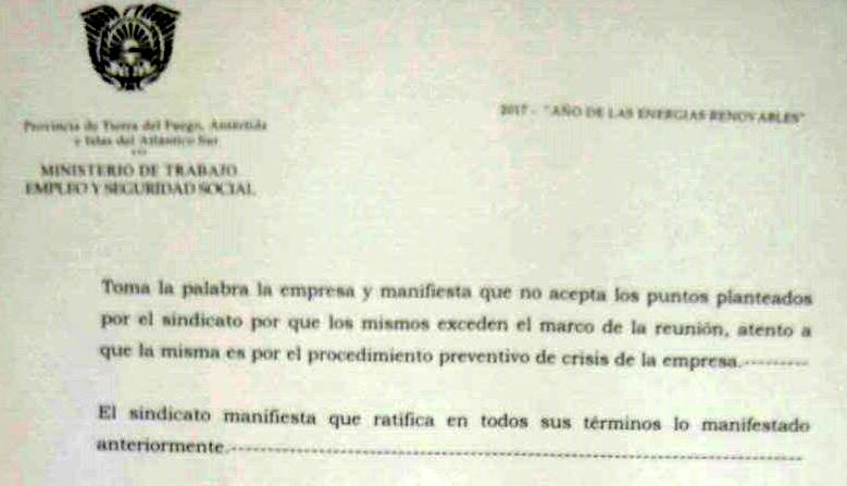 Mientras el Ministro de Trabajo de la provincia, Claudio Carrera, aseguró que “no hay Procedimiento Preventivo de Crisis” en el caso de la empresa Tecnomyl, en la reunión convocada por el paro del 21 de septiembre, el propio Ministerio de Trabajo acepta que la empresa diga que fue a esa reunión por el “Procedimiento Preventivo de Crisis”.