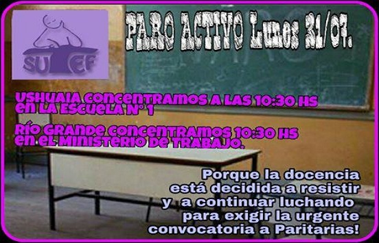 Los docentes de Tierra del Fuego realizarán este lunes 31 de julio, un paro activo por 24 horas en reclamo a la reapertura de la paritaria salarial. Habrá concentraciones en Ushuaia y en Río Grande.