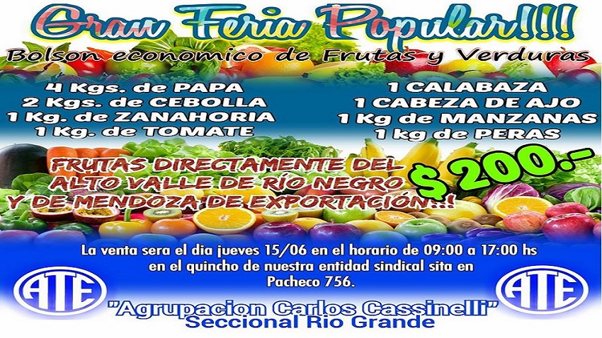 Este jueves 15 de junio, en el horario de 09:00 a 17:00, se llevara a cabo una "Gran Feria Popular de Frutas y Verduras" en el quincho de ATE, sito en Pacheco 756 de Río Grande.