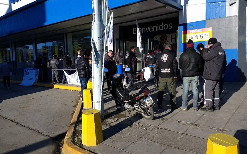 En el marco de una protesta nacional, los trabajadores nucleados en el sindicato SUTCAPRA, rama vigilancia, realizan un piquete en la sucursal céntrica de supermercados Carrefour de la ciudad de Río Grande.