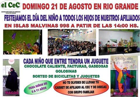 El Centro Empleados de Comercio de Río Grande agasajará a los hijos de los afiliados por el Día del Niño, el próximo domingo 21 de agosto en el Gimnasio de la calle Islas Malvinas a partir de las 14:00 horas.