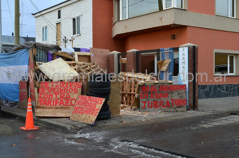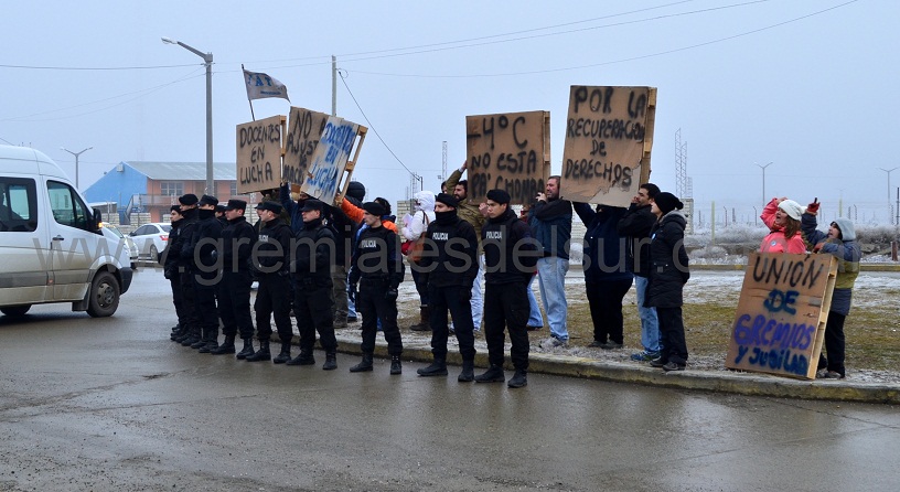 Dirigentes y militantes de la Unión de Gremios y Jubilados Estatales de Tierra del Fuego, se manifestaron en la rotonda de calle Pacheco y Perón luego de los actos que encabezó en Río Grande el Ministro Rogelio Frigerio. GALERÍA DE FOTOS.