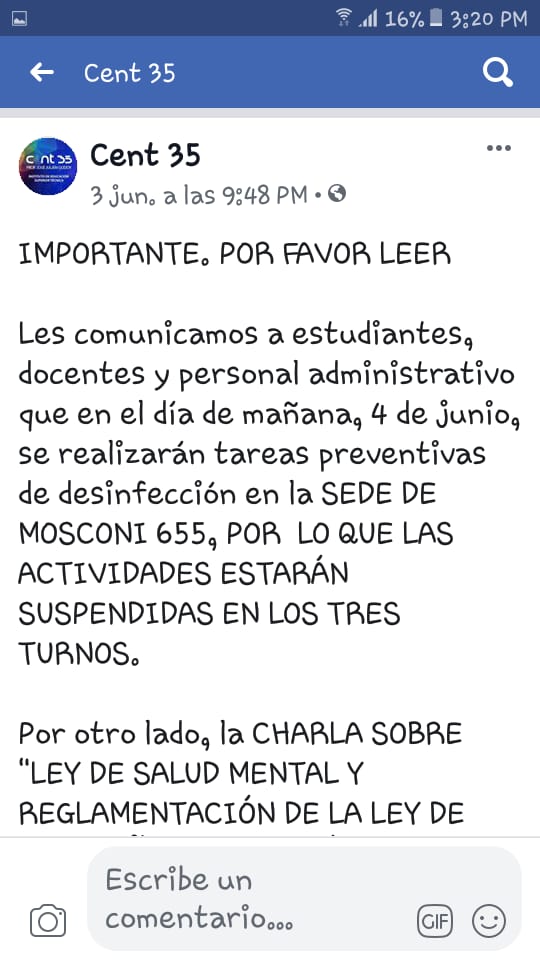 Por repetidas tareas de desinfección y limpieza, es continua la suspensión de actividades en el Anexo del CENT Nº 35 ubicado donde funcionaba el Colegio Dr. Ernesto Guevara. También se mantienen los inconvenientes por problemas de gas en CENS Nº 18 Anexo Escuela Nº 10. Por otra parte, los estudiantes del Colegio Padre Zink, siguen esperando por los 3 tutores que la institución solicitó hace varios meses.