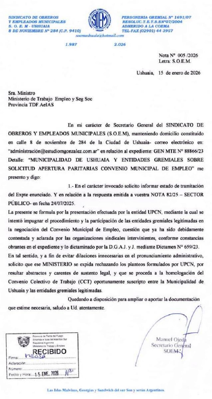 El Sindicato de Obreros y Empleados Municipales (SOEM) de Ushuaia presentó una nota ante el Ministerio de Trabajo de Tierra del Fuego solicitando un pronto pronunciamiento y la homologación del Convenio Colectivo de Trabajo (CCT) del personal municipal.