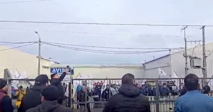 Bajo la consigna “Aires del Sur en Lucha”, los trabajadores son acompañados por dirigentes de la UOM seccional Río Grande. El Cuerpo de Delegados de esa entidad sindical se manifiesta en el exterior de la plana.