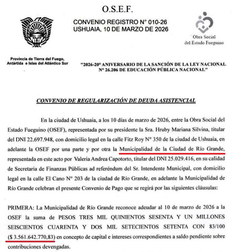 Cabe señalar que los convenios de meción solo son firmados en representación de la OSEF por la Presidenta Mariana Hruby, y tienen la particularidad que ambos son en 36 cuotas; en el caso del convenio con el Gobierno de la provincia el monto es de mas de 11 mil millones de pesos, y en el caso del convenio con el Municipio de Río Grande es por el monto de más de 3 millones y medio de pesos.