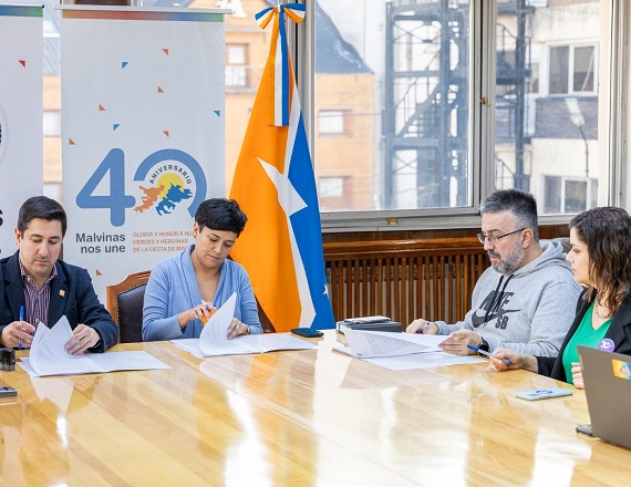 El Ministro de Economía de Tierra del Fuego, Federico Zapata; junto a la Ministra de Educación, Cultura, Ciencia y Tecnología, Analía Cubino; al Secretario General y la Secretaria Adjunta del SUTEF, Horacio Catena y Soledad Rottaris, respectivamente; y el Paritario Javier Mastrocolo; rubricaron un nuevo acuerdo salarial para el sector docente.