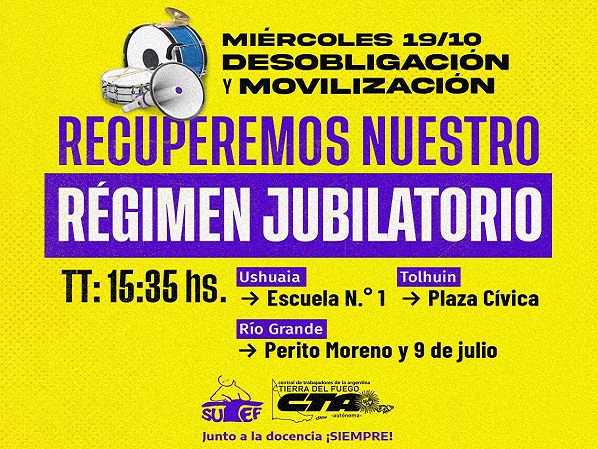 Ante la falta de dictamen de la Legislatura de Tierra del Fuego respecto del proyecto de ley presentado por el SUTEF para la recuperación del régimen jubilatorio docente, este miércoles habrá desobligación en las tres ciudades. Por la mañana, el Congreso de Delegados resolverá sobre la aceptación, o no, de la última propuesta salarial presentada por el Gobierno provincial.