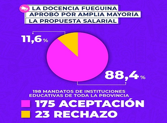 Sobre un total de 198 mandatos para definir si se aceptaba o rechazaba la propuesta salarial del Ejecutivo provincial presentada en Mesa Paritaria Salarial el día 14 de octubre, 175 (88,4%) resultaron por la aceptación, y 23 (11,6%) por el rechazo.