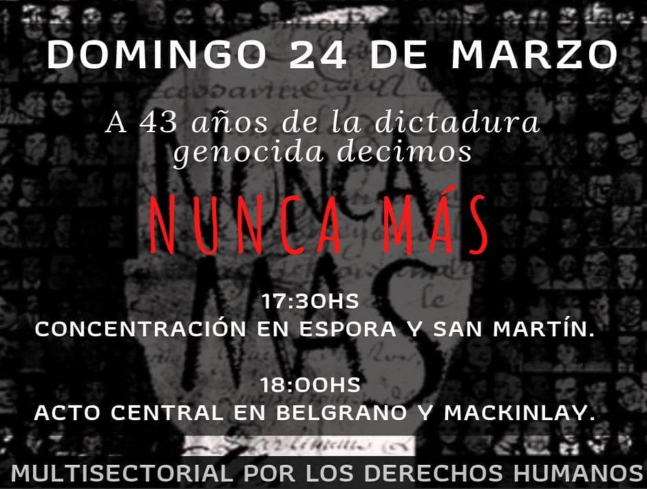 Distintas actividades se llevarán adelante tanto en Ushuaia como en Río Grande, al cumplirse un nuevo aniversario del golpe de estado que dio inicio a la última dictadura. En Río Grande habrá una vigilia con la presentación de artistas y una olla popular el 23. El acto central será el 24 a las 18 en el Espacio para la Memoria. En Ushuaia habrá una radio abierta en Fadul y San Martín el domingo a las 17 horas y luego se movilizará hasta la Plaza de la Memoria.