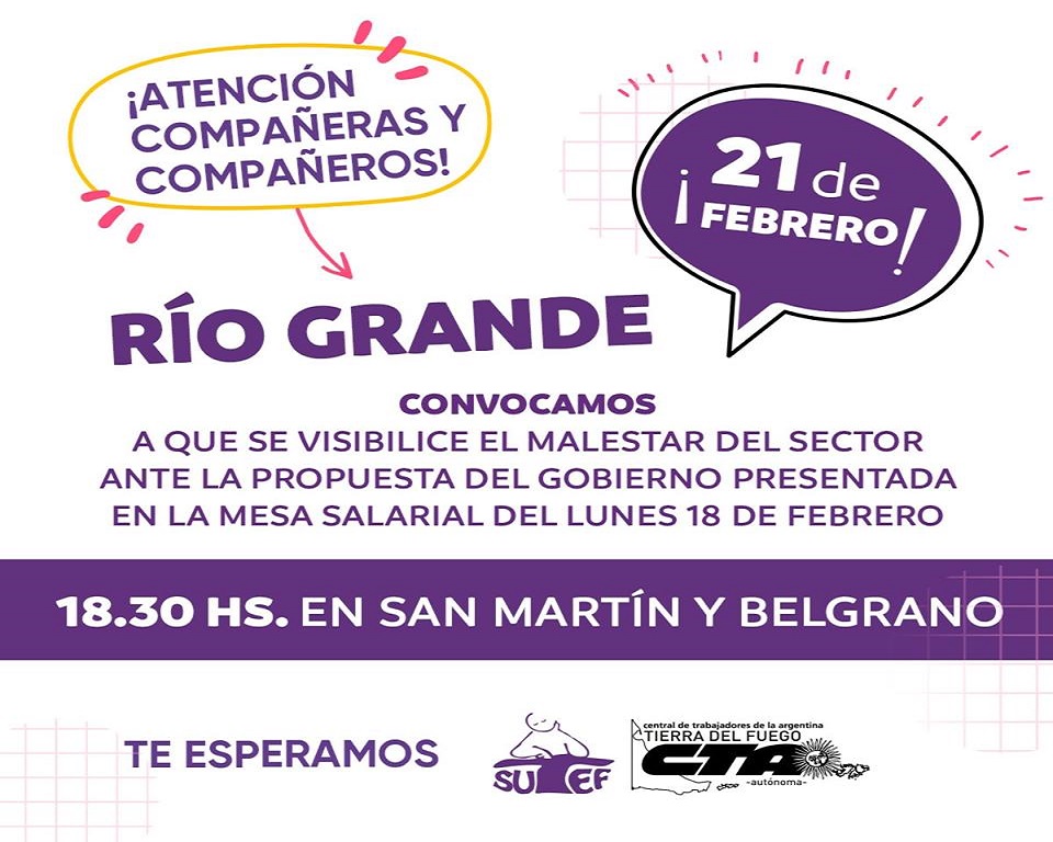 Este jueves 21 de febrero, a las 18:30 horas, en la intersección de las avenidas San Martín y Belgrano de Río Grande, los docentes concentrarán para visibilizar el malestar del sector ante la escaza oferta salarial del Ejecutivo Provincial.