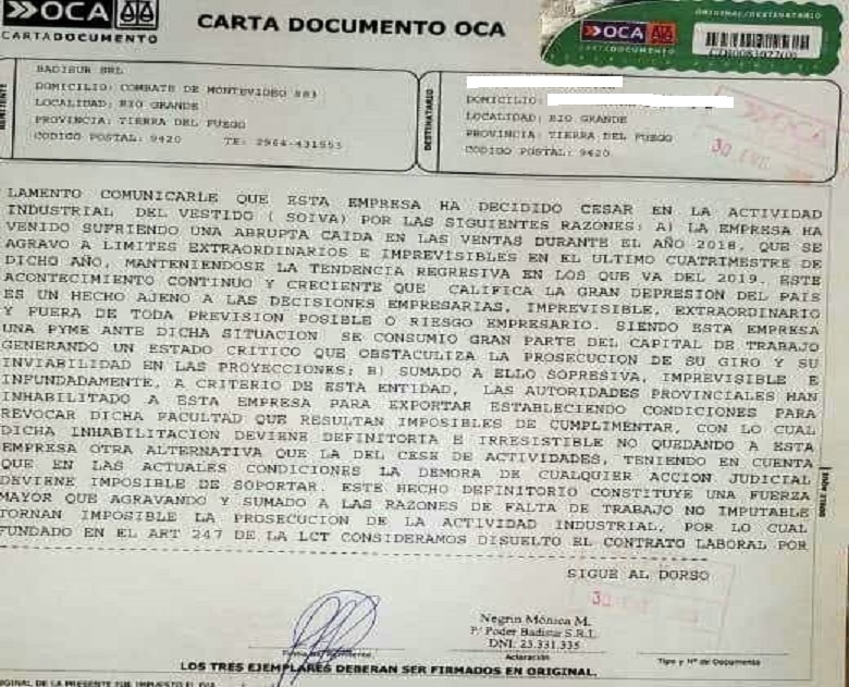 La empresa textil Badisur de la ciudad de Río Grade envió telegramas de despido a todo el personal que pertenece al Convenio Colectivo de SOIVA (industria del vestido), y no se presentó a la audiencia del jueves 31 en el Ministerio de Trabajo de provincia.
