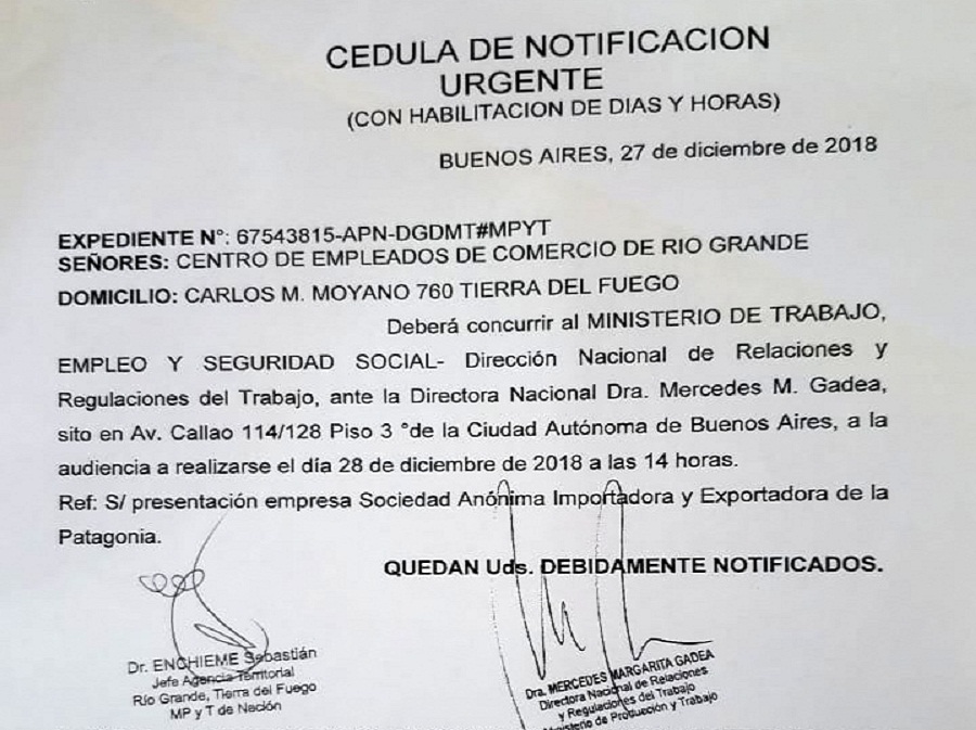 El Centro Empleados de Comercio de Río Grande solicitó al Ministerio de Producción y Trabajo de Nación una prórroga a la audiencia fijada, en principio, para este viernes 28 de diciembre, en virtud de la falta de pasajes por el éxodo vacacional. La entidad sindical también solicitó se les corra vista de la presentación realizada por La Anónima.
