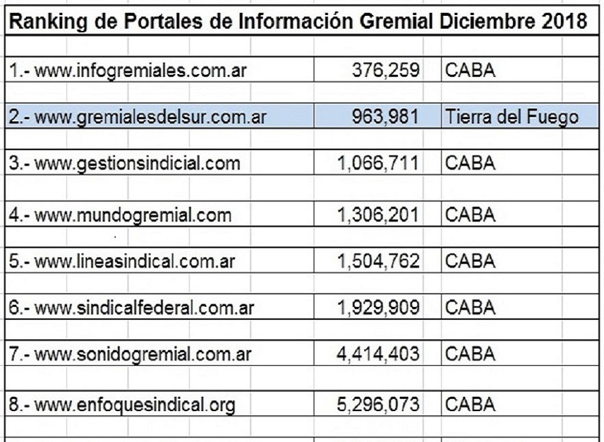 Un ranking de portales de noticias, exclusivamente de origen gremial, ubica al portal de Tierra del Fuego www.gremialesdelsur.com.ar, en el segundo lugar. El ranking contiene solo a portales de Argentina. Los datos estadísticos consolidan la presencia del medio digital fueguino en el contexto de los medios nacionales.