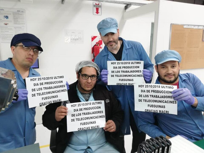 Este jueves 25 de octubre fue el último día de trabajo para los 40 operarios que quedaban produciendo celulares en la empresa Telecomunicaciones Fueguinas S.A. de la ciudad de Río Grande. La empresa ya había reducido personal y las horas semanales de trabajo.