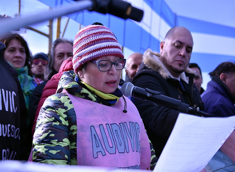 Carina Rial, trabajadora de AUDIVIC, hizo uso de la palabra en el acto del 7A en Río Grande. Además de describir la situación que atraviesan los obreros de esa empresa, le recordó a la Gobernadora que, “somos los trabajadores que usted visitaba cuando estaba en campaña y filmaba para la televisión o se sacaba fotos y nos pedía que la apoyemos. Sería bueno que nos escuche, somos también habitantes de esta provincia”, señaló.