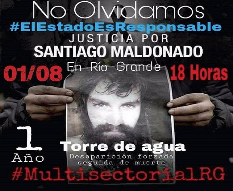 La Multisectorial de Río Grande se movilizará este 1 de agosto a las 18 horas a un año de la desaparición forzada de Santiago Maldonado. La concentración será frente a la Torre de Agua frente a la Plaza Almirante Brown. En Ushuaia la convocatoria será a las 17 horas en Fadul y San Martín.