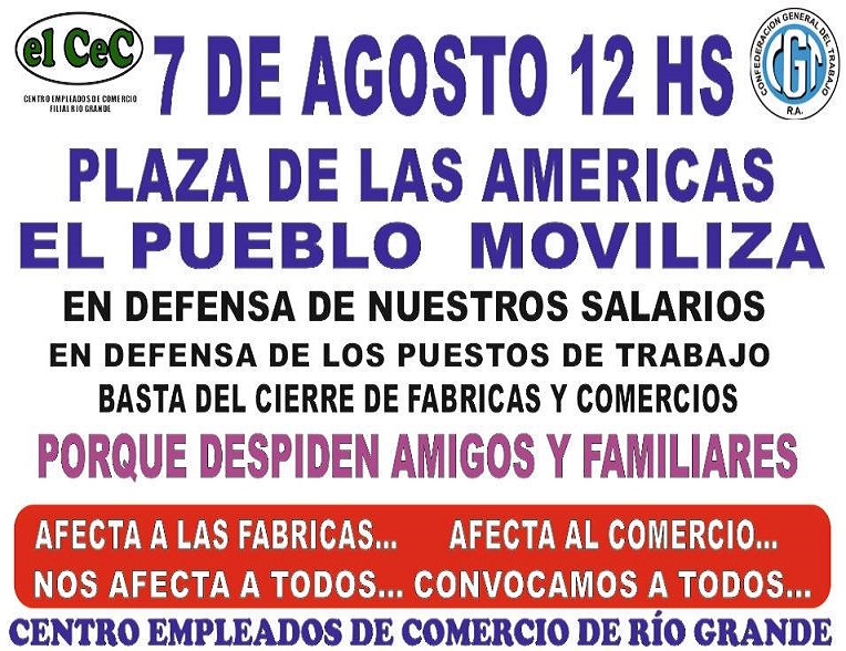 El Secretario Adjunto del Centro Empleados de Comercio de Río Grande, convocó a toda la ciudadanía a la movilización del martes 7 de agosto. La convocatoria es en defensa de los puestos de trabajo, en defensa de los salarios y de la soberanía.