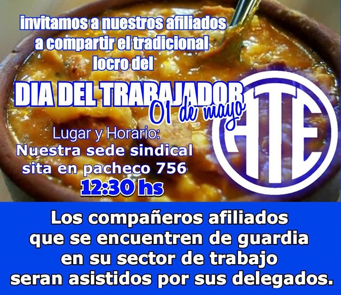 Con motivo de la conmemoración del Día del Trabajador, la Asociación Trabajadores del Estado seccional Rio Grande, ofrecerá locro para sus afiliados en el quincho de la sede gremial.