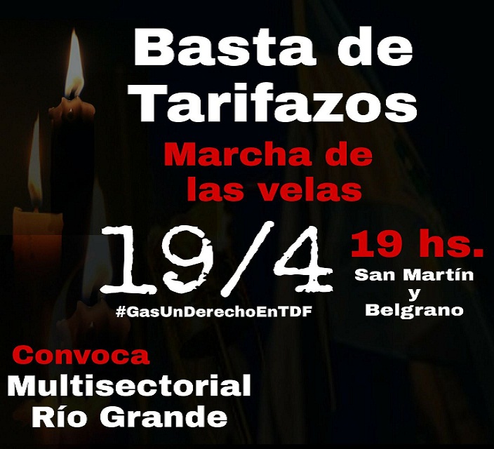 El jueves 19 de abril a las 19 horas, en la intersección de San Martín y Belgrano de Río Grande, se convoca a la Marcha de las Velas a la que adhiere la Multisectorial de Río Grande. Desde ese espacio, cuestionaron el silencio cómplice del Gobierno provincial, ante los tarifazos y aumentos incesantes de precios.