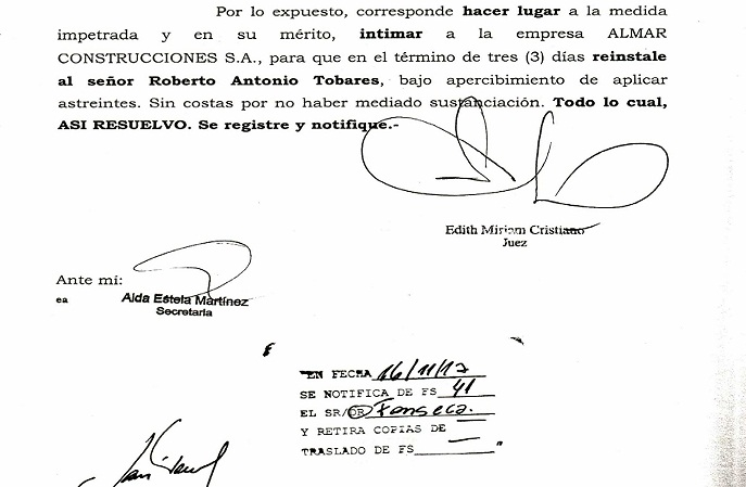 La Justicia le ordenó a la empresa ALMAR Construcciones S.R.L. que reincorpore al trabajador Roberto Tobares. La Jueza interviniente ordenó al empleador reinstale al trabajador en un plazo de tres días, y en los fundamentos destaca la violación, por parte de la empresa, de las garantías establecidas en la Ley Nº 23.551.