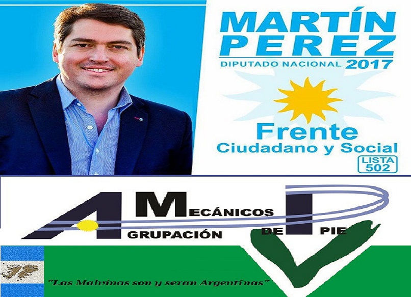 La “Agrupación Mecánicos de Pie” de SMATA, manifestó el apoyo al candidato Martin Pérez, del Frente Ciudadano y Social, en el distrito Tierra del Fuego. En un comunicado de prensa que Pérez, “es la única opción real de oposición al nefasto plan de este Gobierno, que es ni más ni menos que la destrucción de los derechos de los trabajadores”.