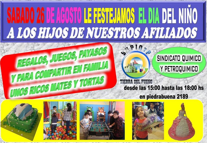 El sindicato de Químicos y Petroquímicos de Tierra del Fuego celebrará el Día del Niño el próximo sábado 26 de agosto en la sede sindical de calle Piedrabuena N° 2.189.