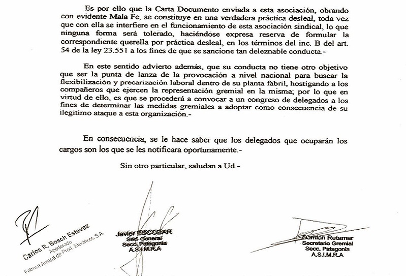 La Asociación de Supervisores de la Industria Metalmecánica de la República Argentina (ASIMRA) Seccional Patagonia, calificó de “práctica desleal” la actitud de la empresa FAPESA de querer intentar disminuir la cantidad de delegados de esa entidad sindical en dicha empresa.