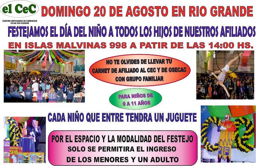 El Centro Empleados de Comercio de Río Grande agasajará a los hijos de los afiliados por el Día del Niño, el próximo domingo 20 de agosto en el Gimnasio de la calle Islas Malvinas a partir de las 14:00 horas.