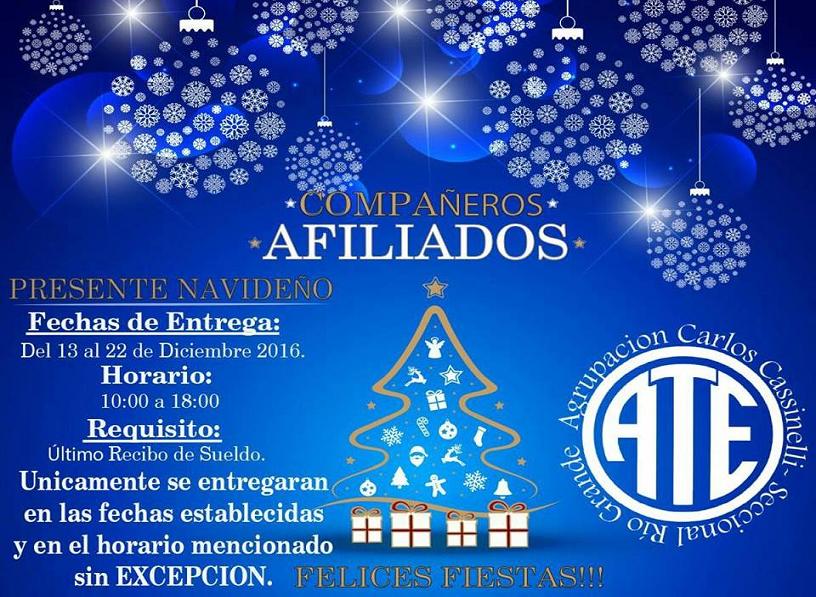 A partir del 13 de diciembre, y hasta el 22 del mismo mes, ATE Río Grande entregará a sus afiliados un presente navideño en la sede sindical de Pacheco 756.
