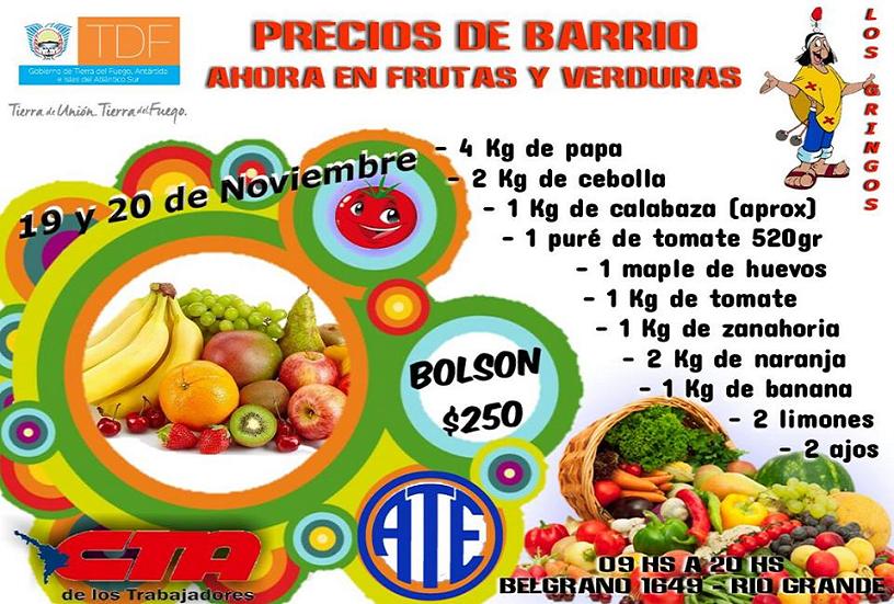 ATE seccional Río Grande, la CTA de los Trabajadores, y la Secretaría de Comercio de la provincia, ponen a la venta bolsones de frutas y verduras. La venta de los mismos se llevará a cabo hasta el día viernes 18 de noviembre de 09:00 a 17:00 horas en la sede sindical cita en la calle Pacheco 756.