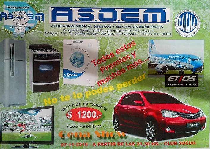 Cada 8 de noviembre se celebra en todo el país el Día del Trabajador Municipal. En Río Grande, el sindicato municipal ASOEM, realiza una gran fiesta el lunes 7 a la noche, donde se sortearán importantes premios, entre ellos, un vehículo 0 km.