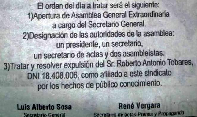 La conducción del sindicato de Petróleo y Gas Privado de Tierra del Fuego, convocó a una Asamblea Extraordinaria para tratar la expulsión de la entidad sindical del trabajador Roberto Tobares, uno de los integrantes del sector disidente identificado como “Petroleros Unidos”.