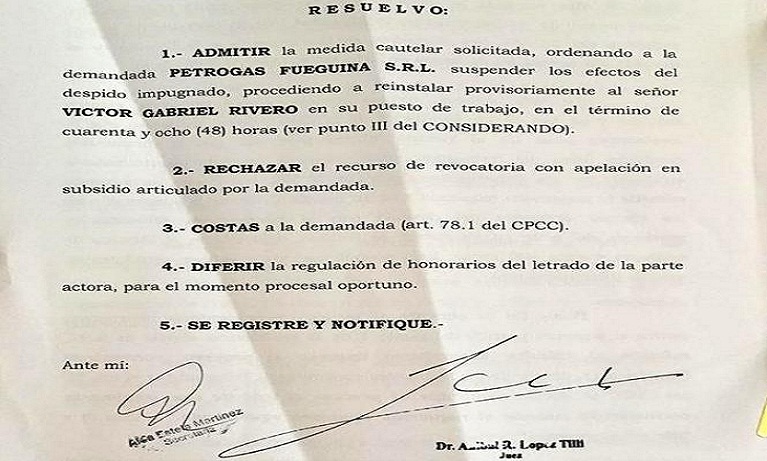 La Justicia ordenó que la empresa Petrogas Fueguina S.R.L. deberá reincorporar al trabajador Víctor Rivero. Rivero es uno de los trabajadores que llevó adelante la protesta frente a la sede de Petroleros Privados por la inacción gremial del sindicato ante los despidos en varias empresas de Río Grande.