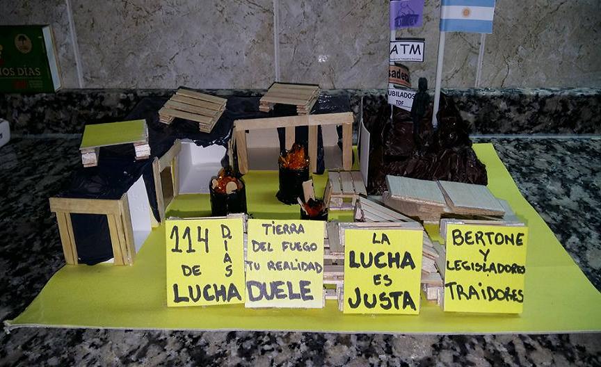 El acampe de los trabajadores estatales en la ciudad de Río Grande tiene una réplica en maqueta elaborada por un alumno de segundo grado de la Escuela Nº 27. La mamá del alumno, es una docente en lucha, desde hace 114 días, que reclama por los derechos cercenados por el Gobierno de Tierra del Fuego.