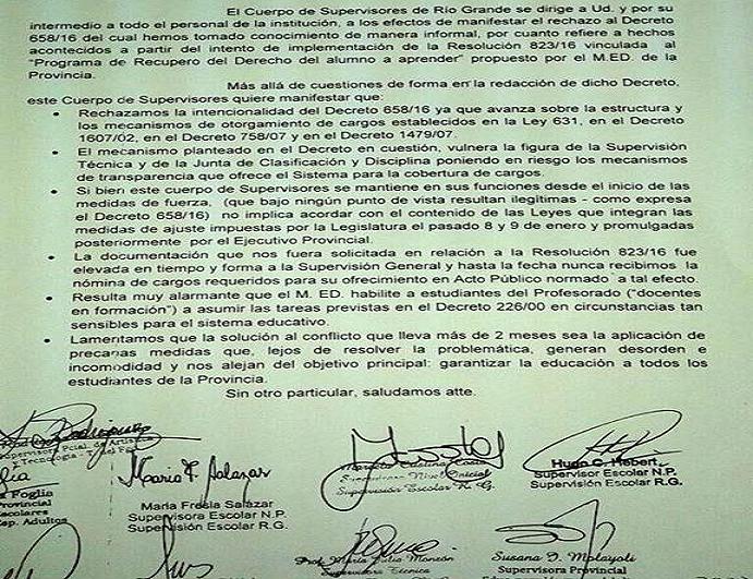 Supervisores escolares de Río Grande rechazan el otorgamiento de cargos rompehuelgas por avanzar sobre la estructura y los mecanismos establecidos en la Ley 631 para dar cargos docentes.