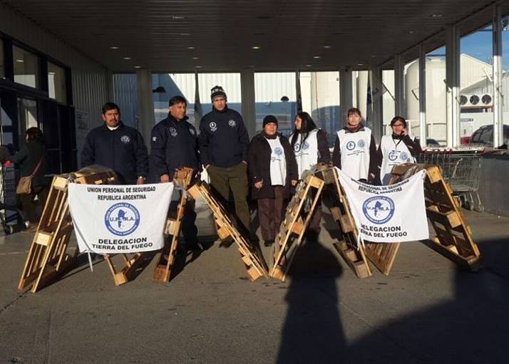 La Unión de Personal de la Seguridad de la República Argentina realiza medida de fuerza durante la jornada de este lunes en toda la Patagonia. En Río Grande los trabajadores se manifestaron en el acceso al supermercado de la rotonda de San Martín y Santa Fe.