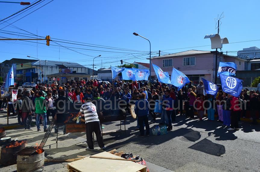 Una importante cantidad de trabajadores estatales mantienen la protesta frente a la Delegación de Legislatura en la ciudad de Río Grande. La avenida Perito Morena está cortada en los sentidos de circulación.
