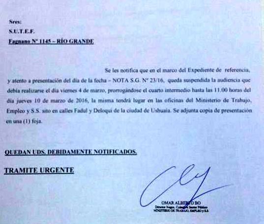 El Ministerio de Trabajo de la provincia, a pedido de Ejecutivo, comunicó al SUTEF la suspensión de la reunión paritaria que estaba prevista para el viernes 4 de marzo, estableciendo nueva fecha de reunión para el jueves 10 de marzo.