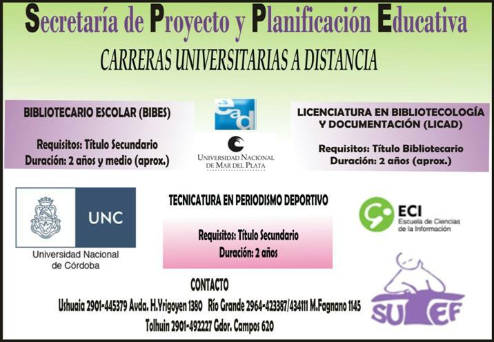 SUTEF informó que se encuentran abiertas las inscripciones para cursar las carreras universitarias a distancias de “Bibliotecario Escolar” y “Periodismo Deportivo”.