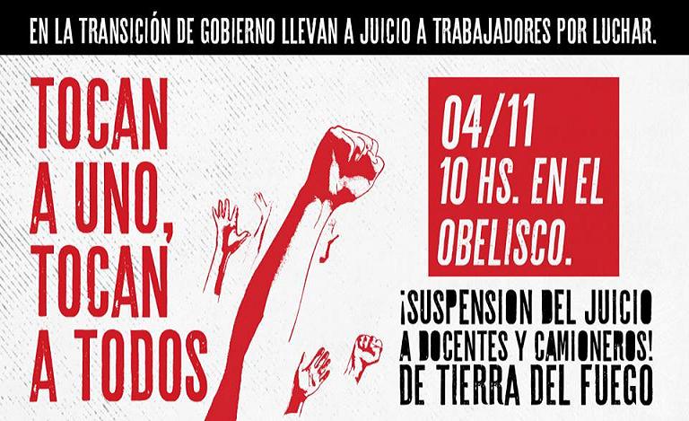 Varias organizaciones gremiales y políticas convocan a una concentración en Capital Federal, con punto de concentración en el Obelisco, y posterior macha hacia la Casa de la Provincia de Tierra del Fuego. Es en repudio al enjuiciamiento de trabajadores fueguinos.
