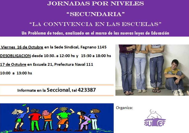 Organizada por el SUTEF, se realizará en Río Grande, los días viernes 16 y sábado 17 de octubre, una Jornada Pedagógica de Nivel Secundaria, denominada “La Convivencia en las Escuelas”. la misma se desarrolla en marco de las nuevas leyes de educación, tanto nacional como provincial.