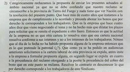 La empresa YSUR solicitó que las actuaciones por el Expte. Nº 1554/11 sean remitidas al Ministerio de Trabajo de Nación, petitorio que fue rechazado por la entidad sindical.