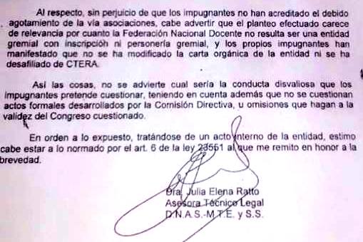 “El planteo efectuado carece de relevancia” dice un párrafo el dictamen de la Dra. Ratto, con relación al pedido de impugnación a la convocatoria al Congreso Extraordinario del SUTEF realizado el pasado 27 de marzo de 2015.
