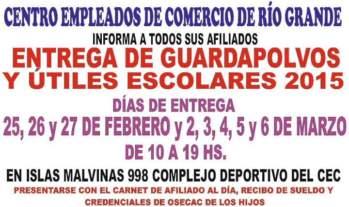 El Centro Empleados de Comercio de Río Grande informó que desde el jueves 25 de febrero se entregaran las canastas escolares y guardapolvos para los hijos de afiliados.