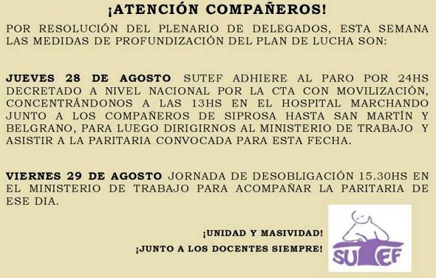 Los Plenarios de Delegados del SUTEF resolvieron adherir al paro de actividades que realizará la CTA el próximo jueves 28 de agosto. En Río Grande habrá una concentración en el Hospital y posterior marcha hasta San Martín y Belgrano.