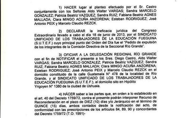 El Ministerio de Trabajo de la Nación declaró la “ineficacia jurídica” del Congreso Extraordinario Provincial del SUTEF llevado a cabo el 18 de junio de 2013, cuyo punto principal era el “pedido de expulsión de los integrantes de la CD de la seccional Río Grande”.