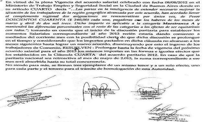 Dirigentes del CEC y de la Cámara de Comercio de Río Grande firmaron en sede ministerial la prórroga de la vigencia de la clausula 4 del acuerdo 2012. El acuerdo es hasta la fecha de vigencia del próximo acuerdo salarial para el 2013.