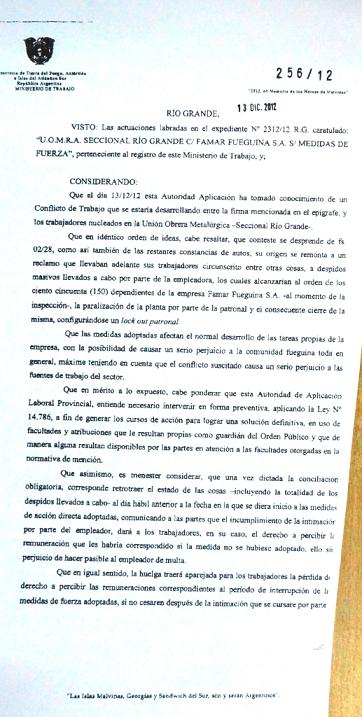 El Ministerio de Trabajo de la provincia dictó la conciliación obligatoria, por lo que la empresa deberá retomar normalmente sus actividades reincorporando a la totalidad de los operarios despedidos. VER RESOLUCIÓN Nº 256/12